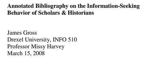 Gross, J. (2008). Annotated Bibliography on the Information-Seeking Behavior of Scholars & Historians.