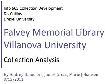 Hamelers, Audrey, et al. “Collection Analyst Report: Falvey Memorial Library, Villanova University.” Unpublished Paper, 2011.