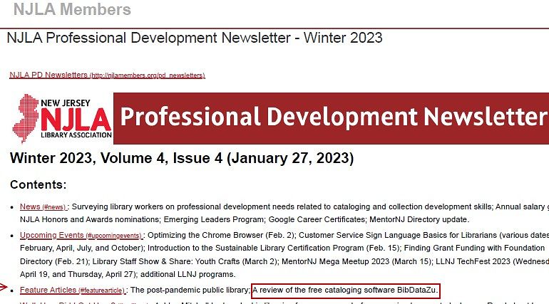 Gross, James. Review of the Free Cataloging Software, BibDataZu. NJLA Professional Development Newsletter. Vol. 5. New Jersey Library Association, 2023.